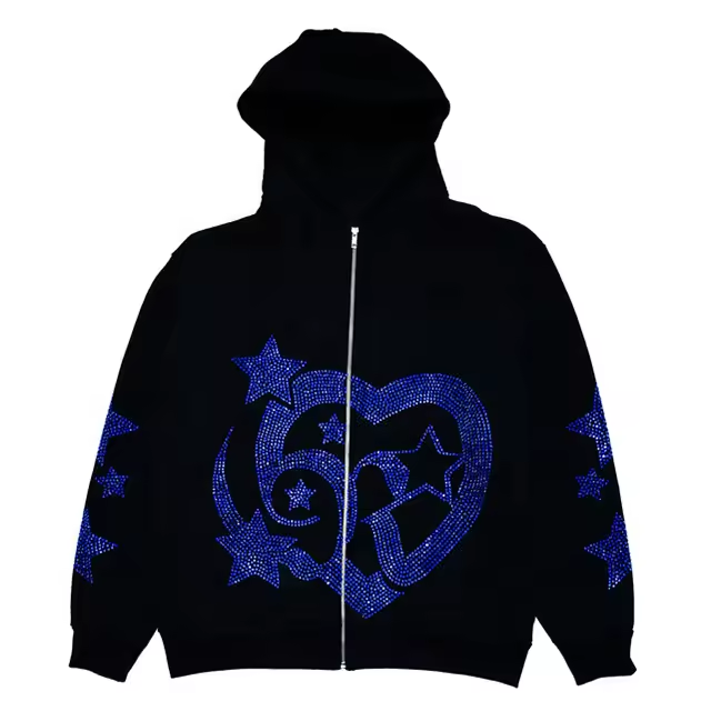 Sweat à capuche zippé avec logo personnalisé de haute qualité pour hommes Sweat-shirt surdimensionné en coton et polyester pour motif solide en strass à impression bouffante