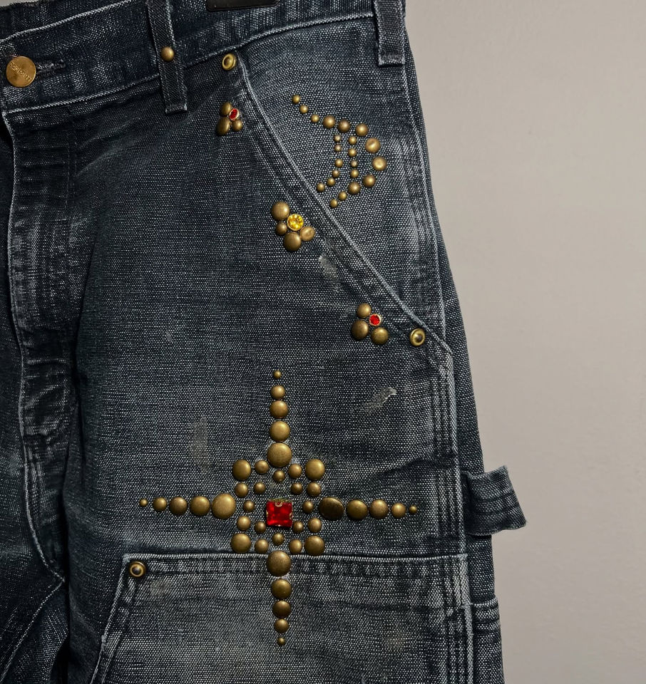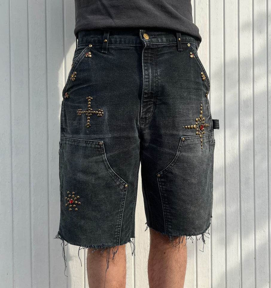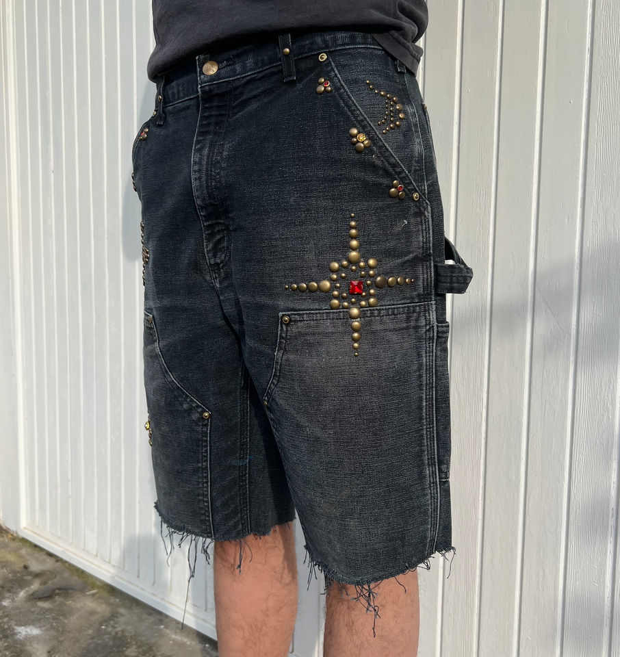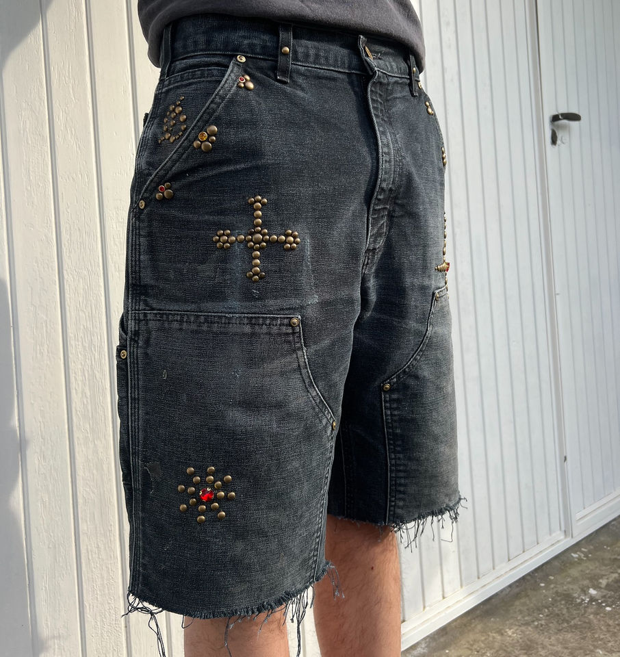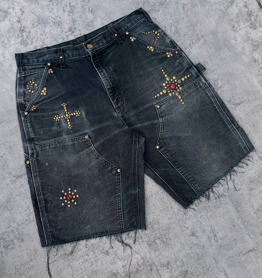 High Quality Custom Shorts Distressed Washed Raw Hem Denim Jorts Baggy Vintage Double Knee Studs Rivet Rhinestone Jean Shorts