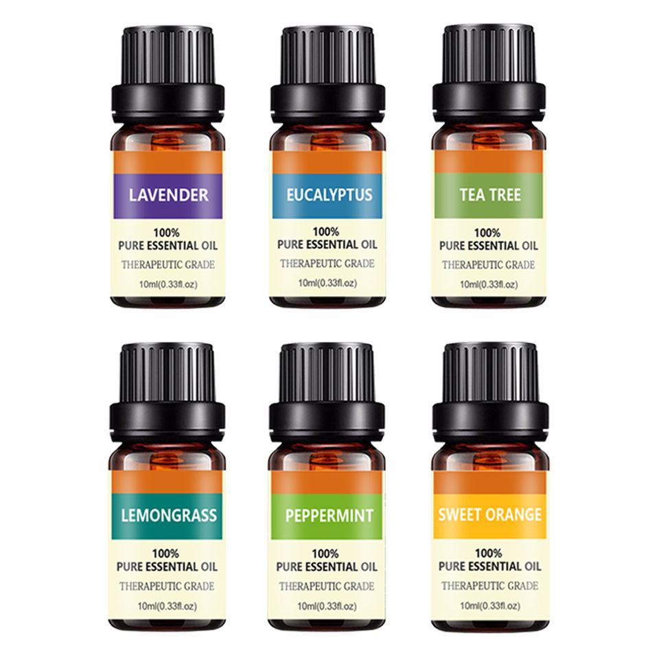 Rose, Romarin, Arbre de thé, Eucalyptus, Lavande, Citron, Orange, Jasmin, Encens, Bergamote , Menthe poivrée