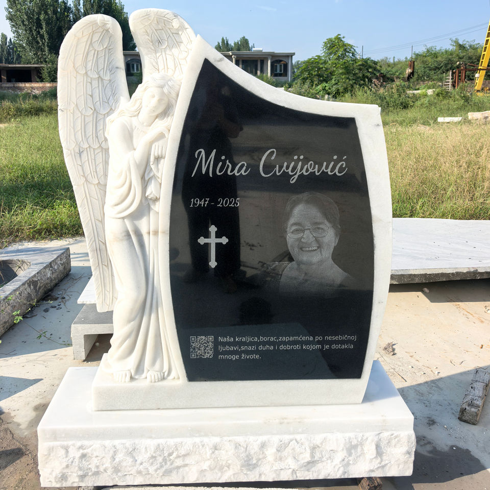 Pierre tombale d'ange en marbre moderne personnalisable de haute qualité-Blanc et noir Ajouter une photo et une inscription pour une utilisation au cimetière