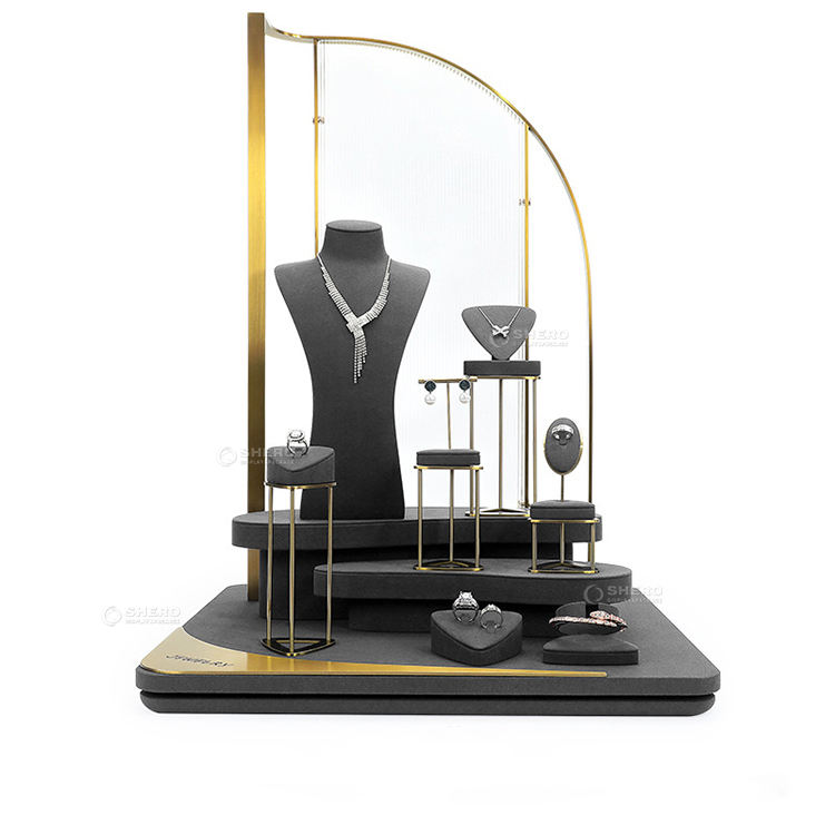 Support d'affichage de bijoux de luxe en microfibre et métal de haute qualité, personnalisable, pour boucles d'oreilles, bagues, colliers, ensemble de présentoirs à bijoux