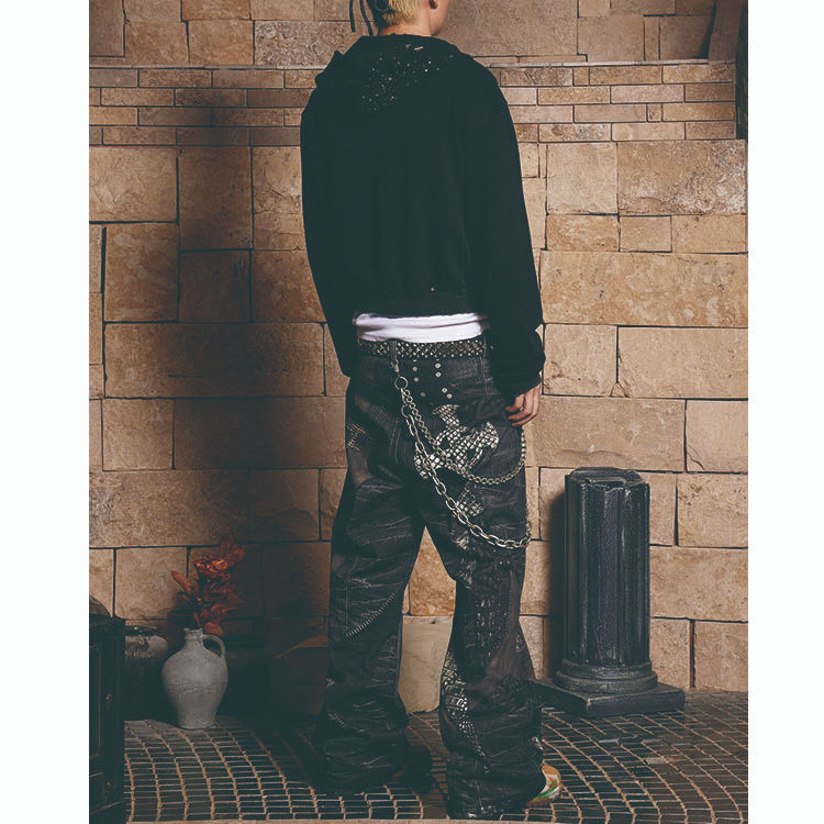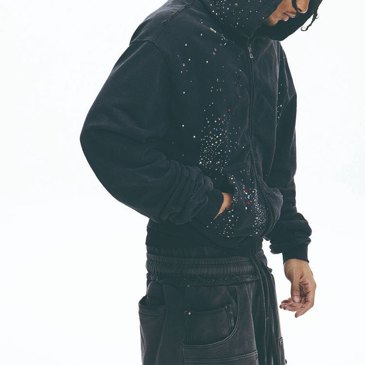 Sweat-shirt en coton côtelé à épaules tombantes personnalisé de haute qualité avec strass, effet vieilli, fermeture éclair, vintage, pour homme