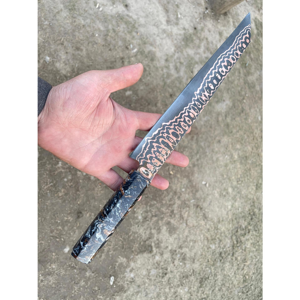 Couteau à découper le jambon et le brisket de haute qualité, en acier Damas cuivré, pour camping et chasse, avec manche en résine éblouissante, tranchant, pour bricolage et OEM