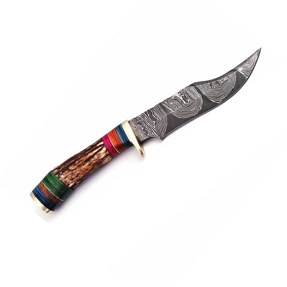 Couteau Skinner Camping en plein air de chasse en acier damas de haute qualité, manche en bois de cerf avec gaine en cuir