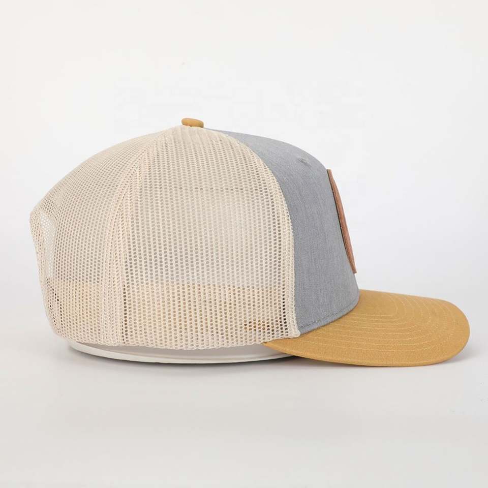 Conception de haute qualité 6 panneaux Gorras vente en gros personnalisé à la mode casquette de camionneur en cuir Patch Logo gris coton Sport classiques chapeau en maille