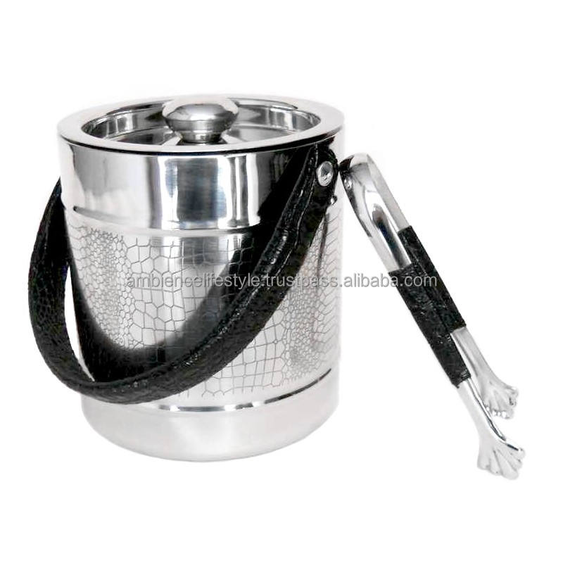 High Quality Designer Stainless Steel Metal Ice Bucket Tongs Leather Handle for Cocktail Bars Hotels Ambience Lifestyle