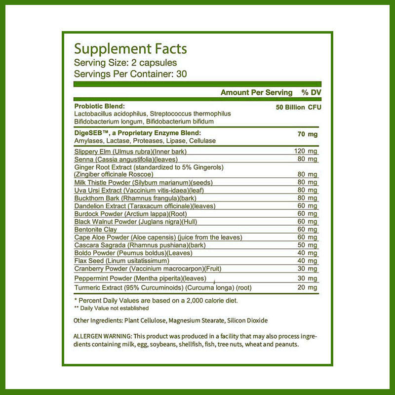 Ingrédient principal:Mélange de probiotiques, Enzymes, Complexe détox à base de plantes, Stéarate de magnésium