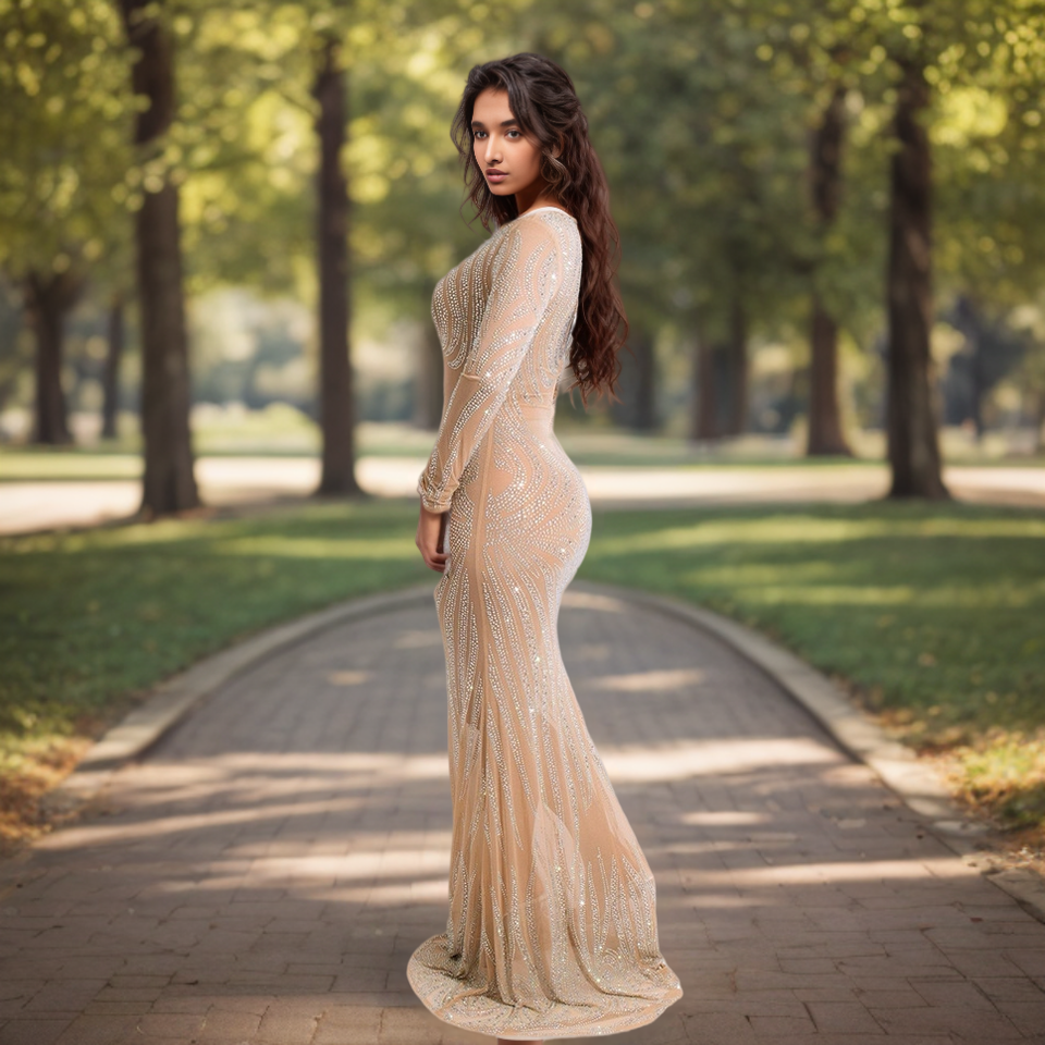 Robe de soirée longue en fibre de polyester écologique de haute qualité, taille empire, col rond, traîne balayante, respirante et ornée de paillettes