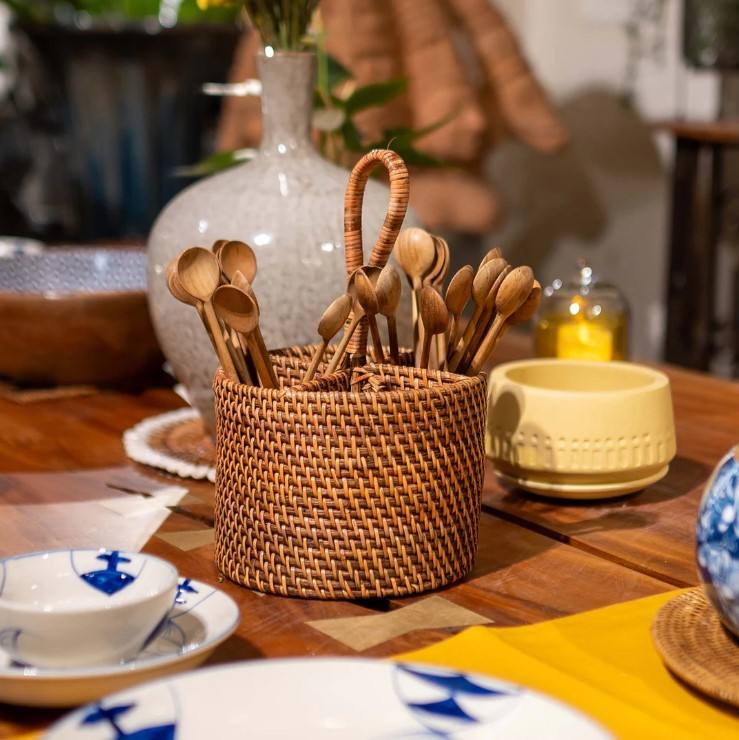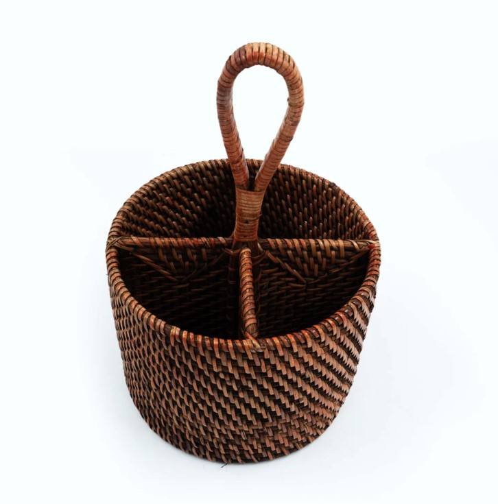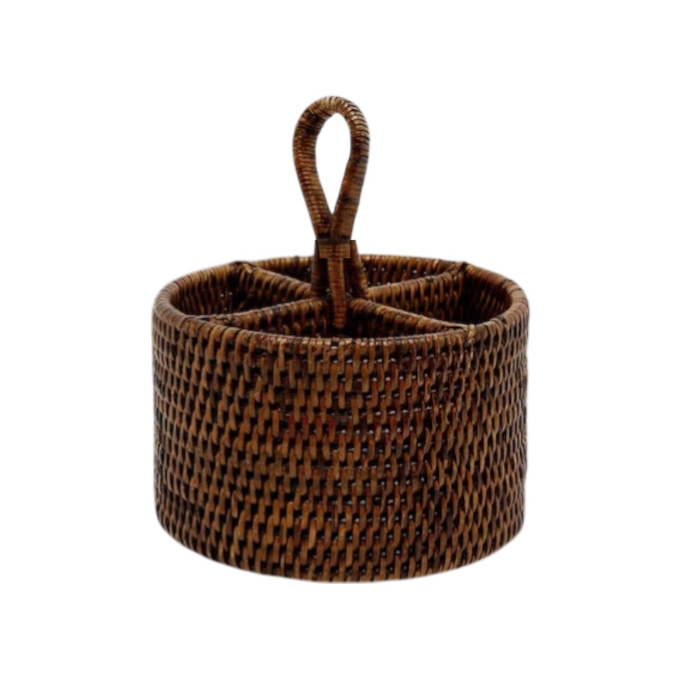 Round Rattan 4-Compartment Handwoven Utensil Holder