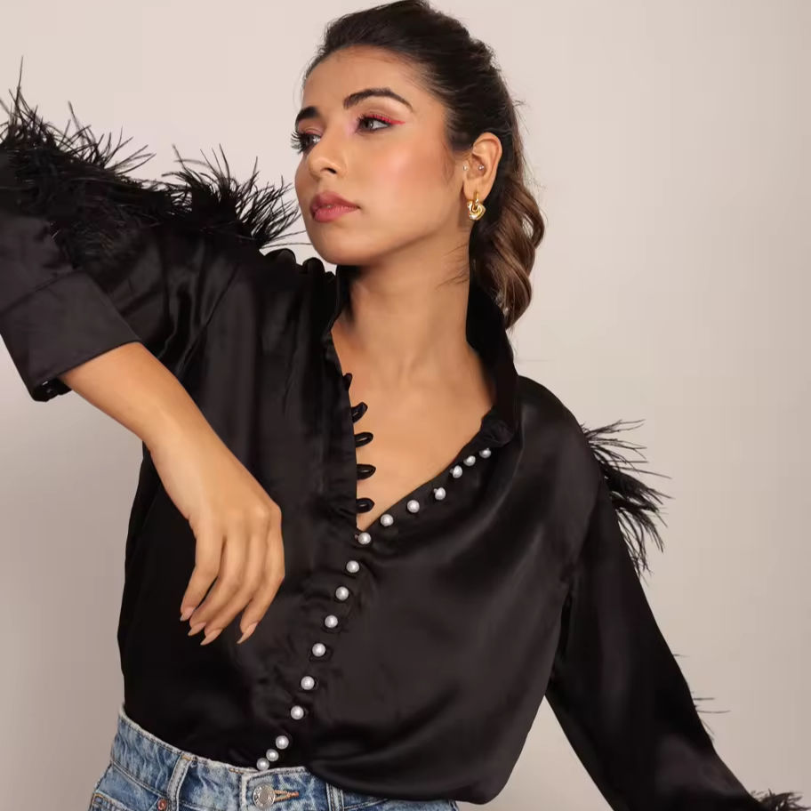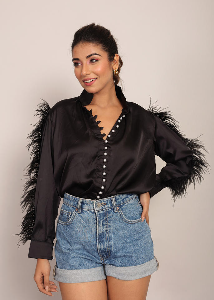 Product Name:Black Feather Sleeves Top With Closer Pearl Buttons