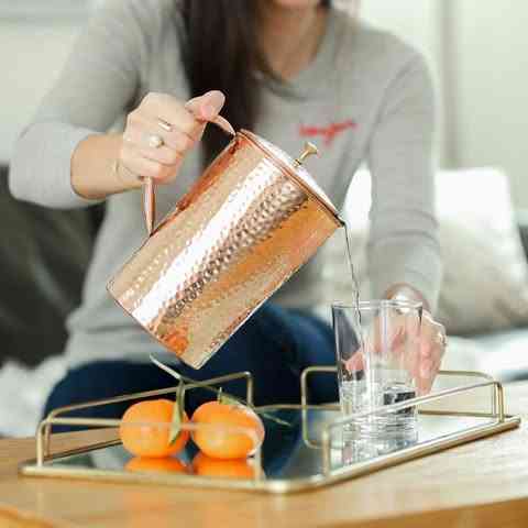 Carafe en cuivre et laiton de haute qualité, écologique, luxueuse, élégante, avec un design gaufré, poignée de couvercle, service de verres, eau, utilisation à la maison, cuisine