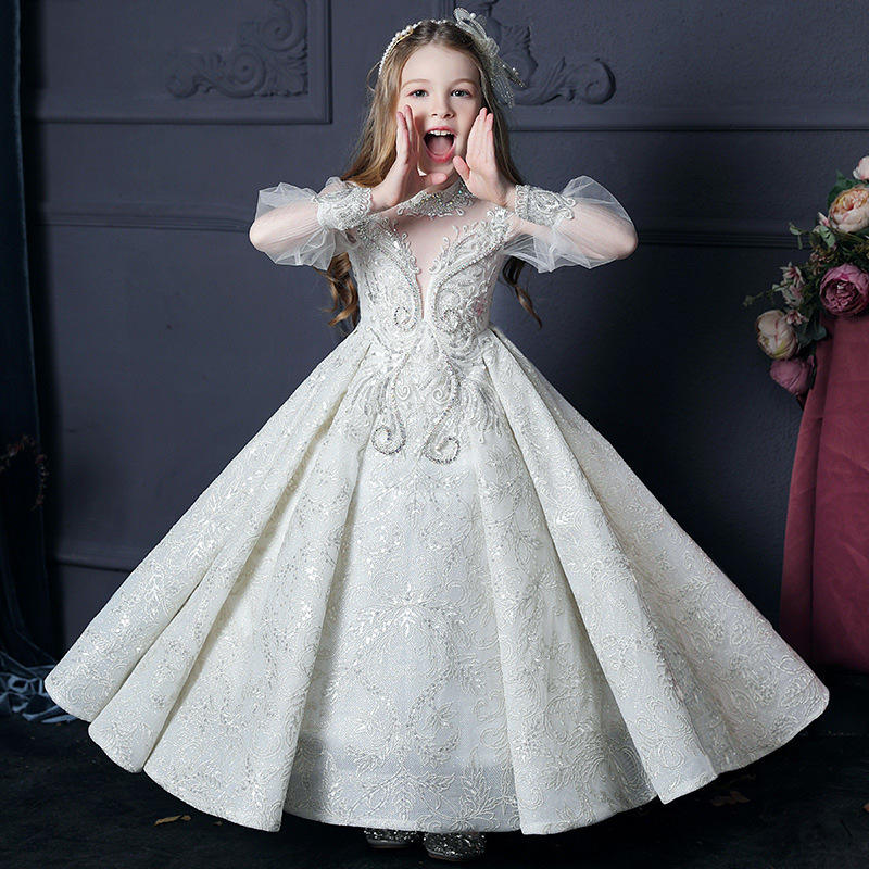 Robes de cérémonie pour enfants de haute qualité, brodées et ornées de perles, avec nœud, pour demoiselles d'honneur, mariage, communion, concours de beauté et fêtes, blanches