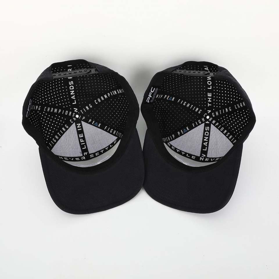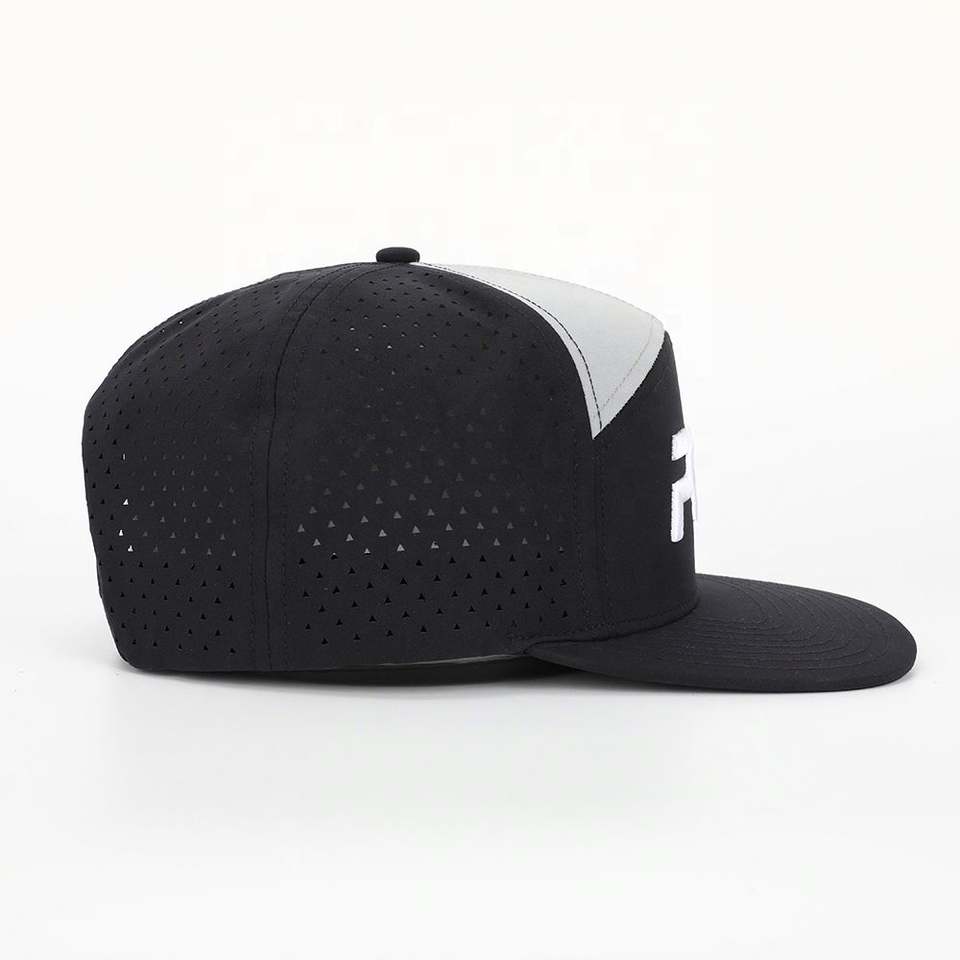 Logo brodé de haute qualité 7 panneaux en polyester à bord plat trou découpé au laser Gorras vente en gros de casquette Snapback noire étanche personnalisée