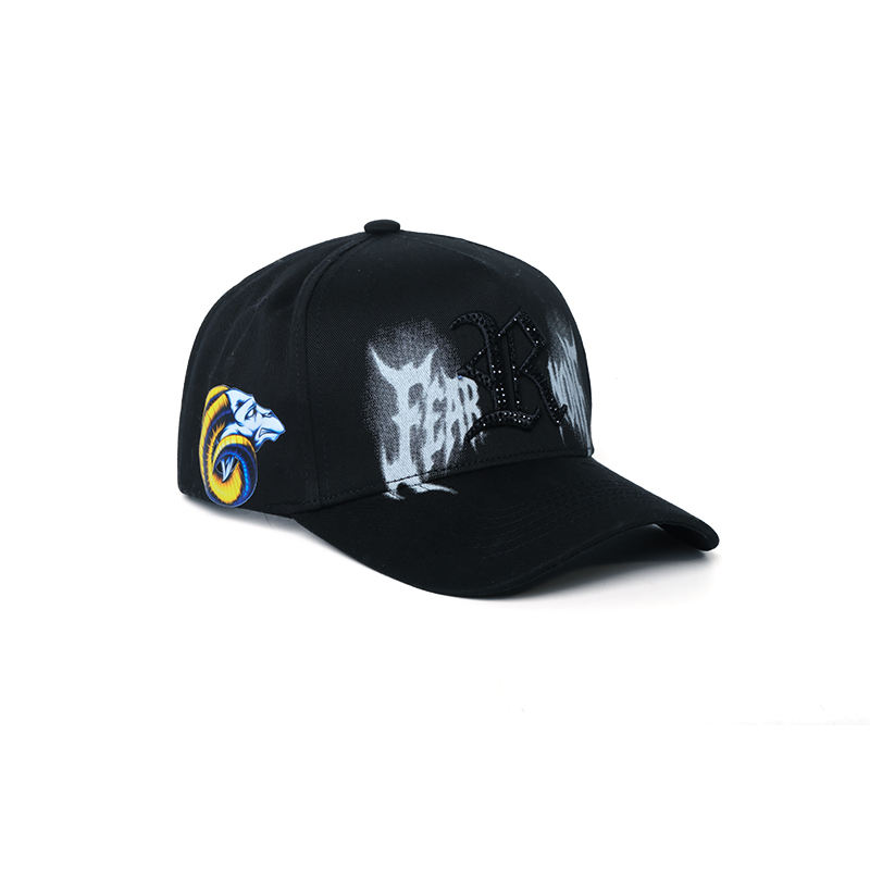 Casquette de baseball de luxe personnalisée FEAR NONE de haute qualité avec broderie 3D et strass noirs – Logo personnalisé