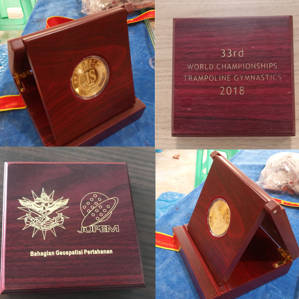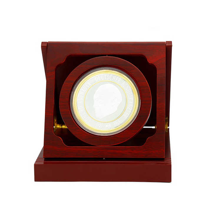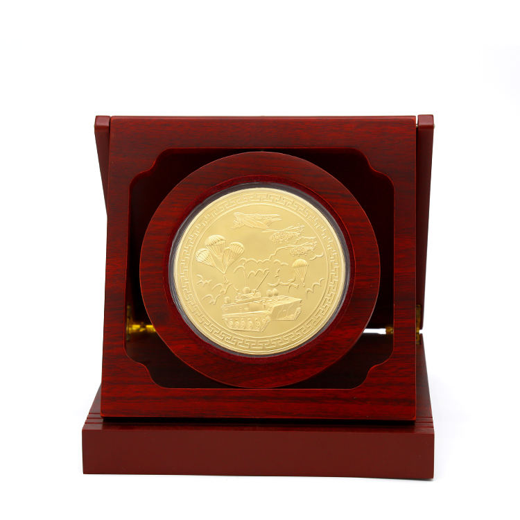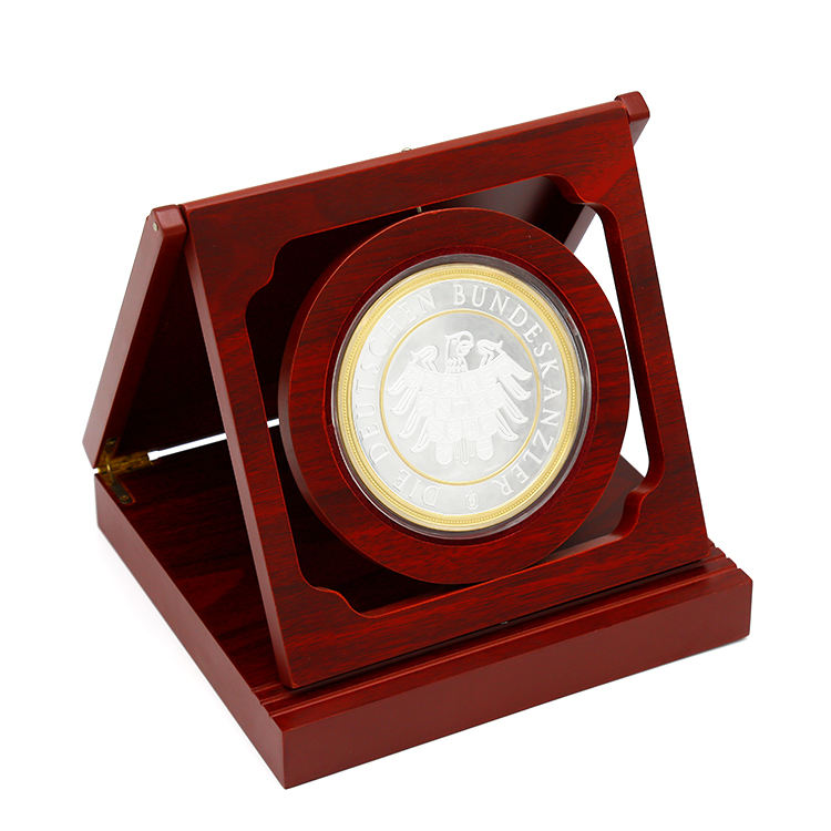 Usine de haute qualité personnalisé métal deux tons couleur défi pièces présentoir porte-monnaie en bois boîte à monnaie en bois pour cadeau