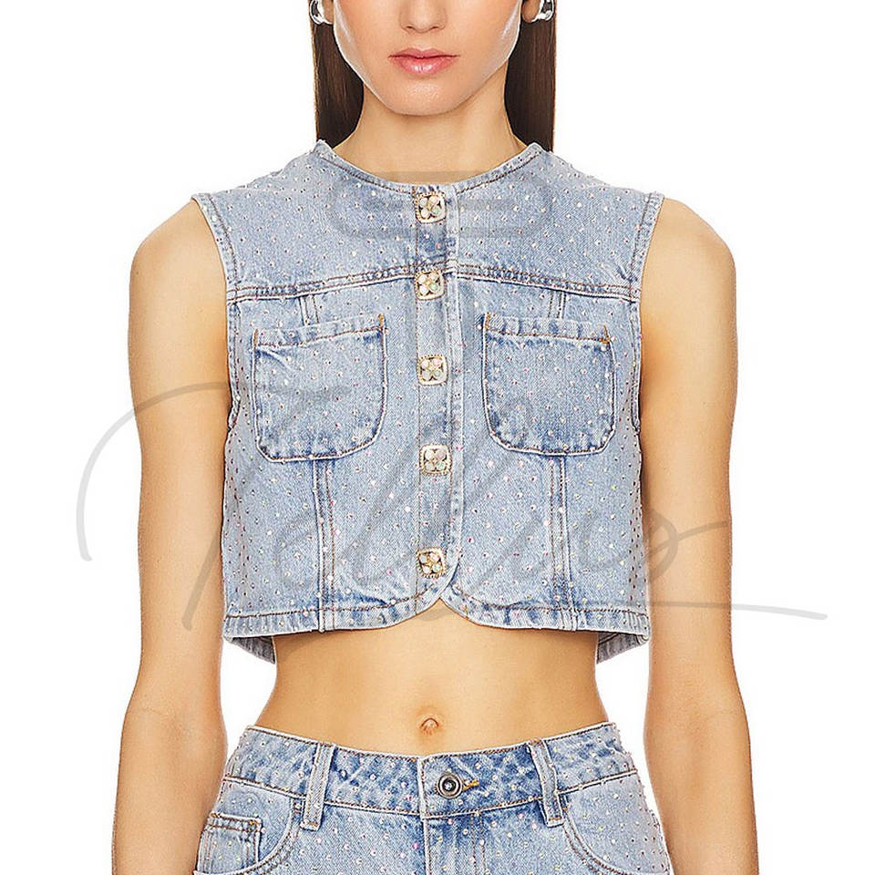 Tops en jean pour femmes de haute qualité, tendance et ornés de strass, vente en gros, design et logo personnalisés.