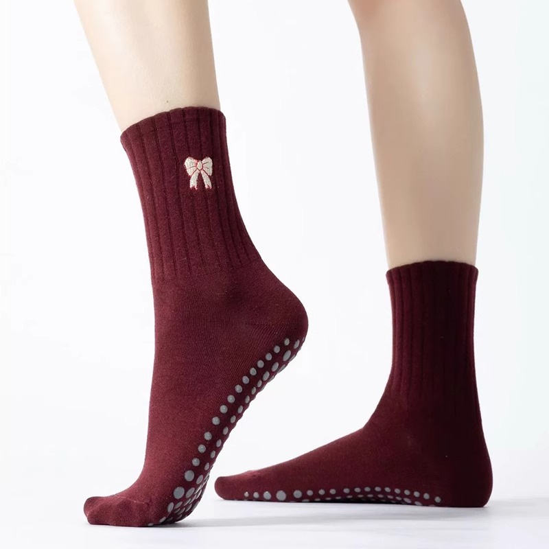 Chaussettes de Pilates antidérapantes pour femme, haute qualité, avec nœud côtelé, en Spandex et coton, pour jeunes, thèmes personnalisés vin et cerises, logo sous le pied