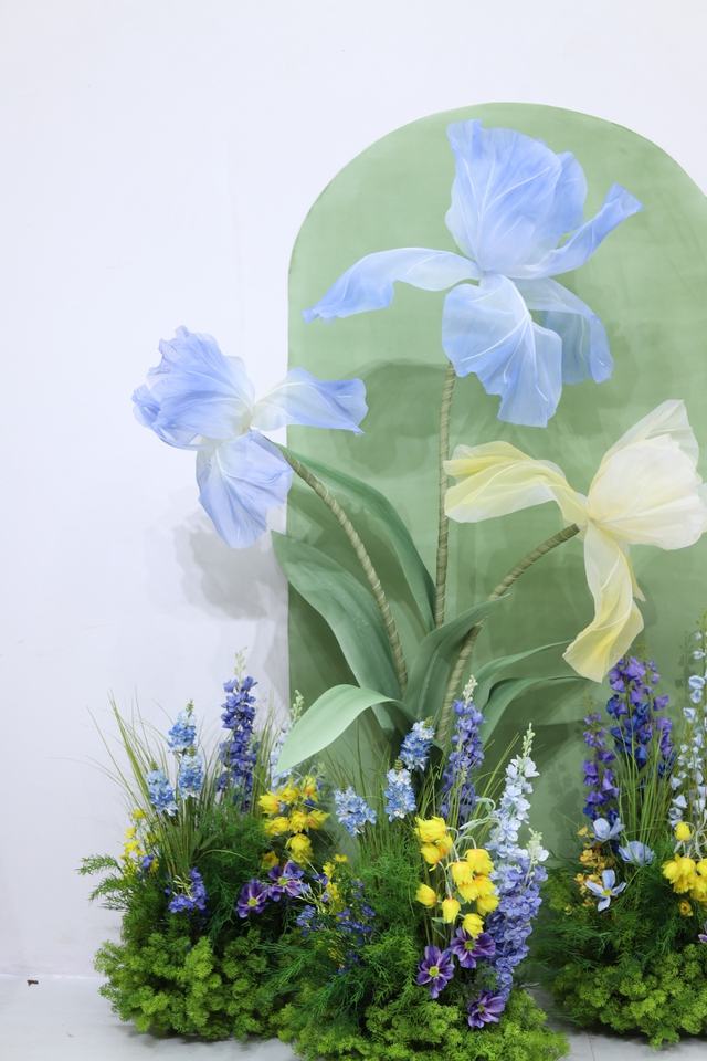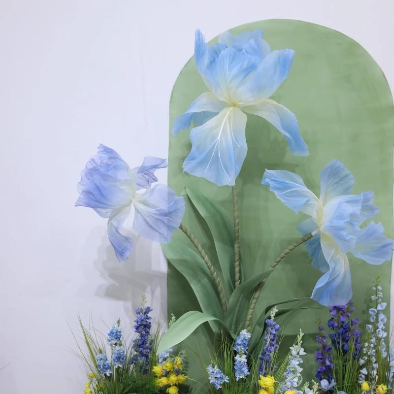 Nom du produit:Décoration de mariage avec fleurs géantes, iris violets et bleus en organza sur pied