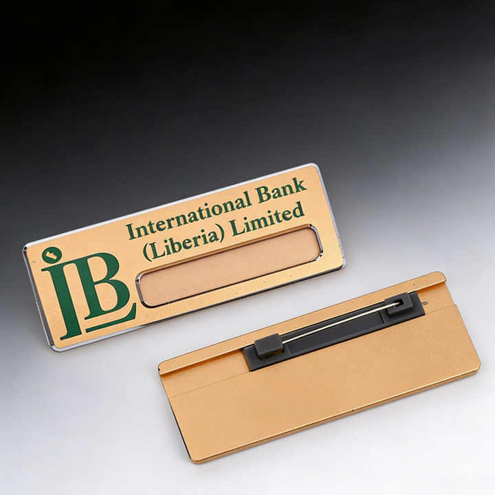 Plaque nominative de haute qualité en métal doré, réutilisable, durable, impression personnalisée avec épingle de sécurité pour employé financier