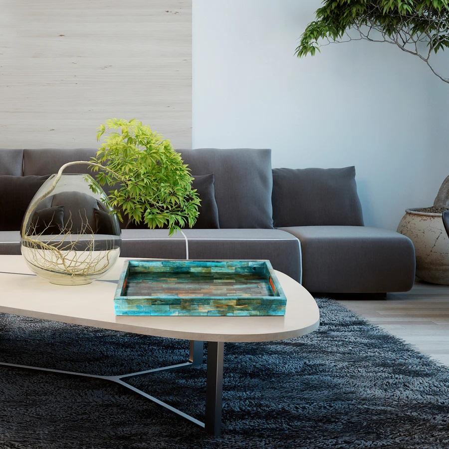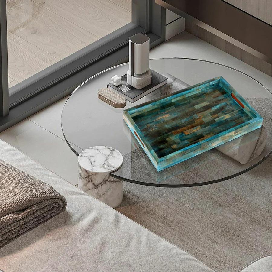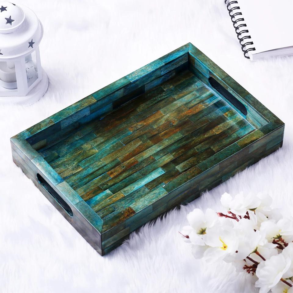 Plateau de service rectangulaire en bois naturel fait main, incrusté d'os, de haute qualité et durable, inspiré des dernières tendances de la décoration intérieure