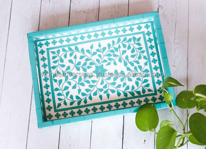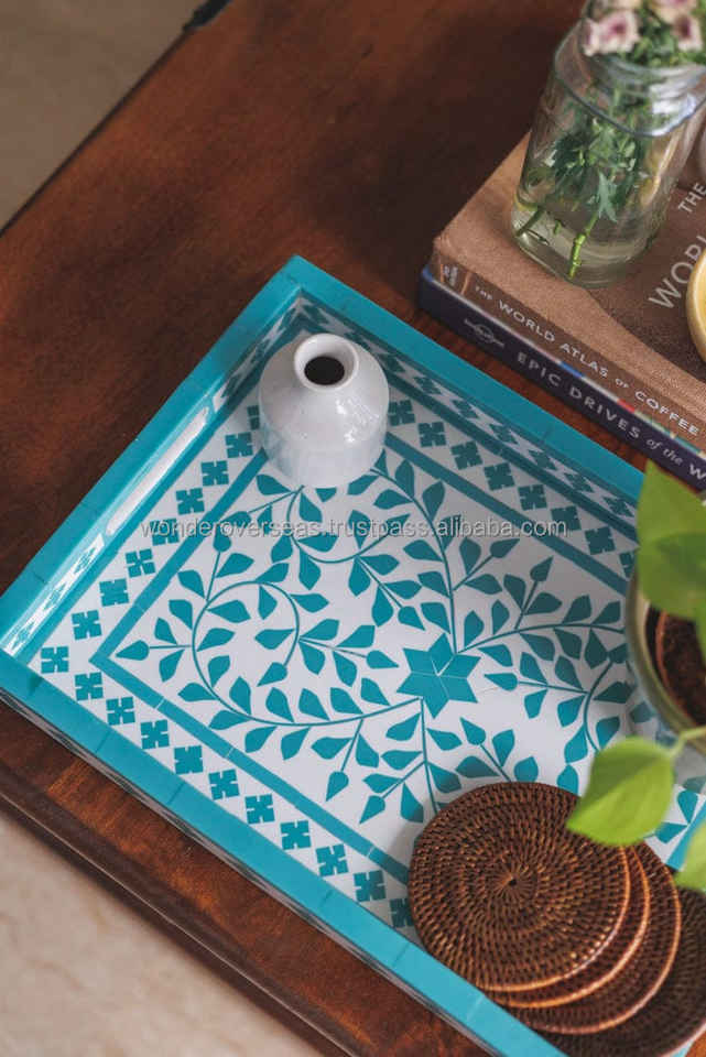 Plateau de service rectangulaire en incrustation d'os en bois naturel de haute qualité, dernière conception pour la maison, inspiré des hôtels, en Inde