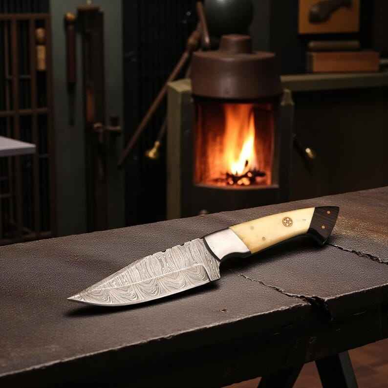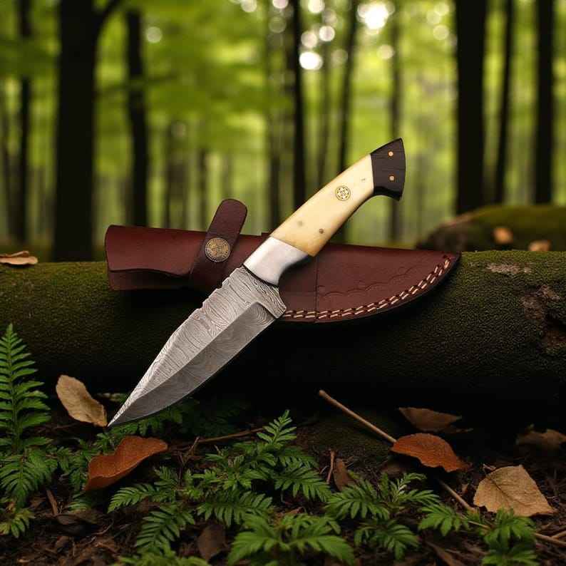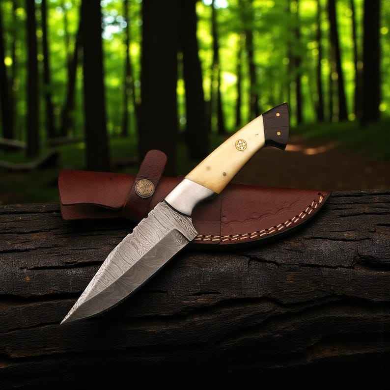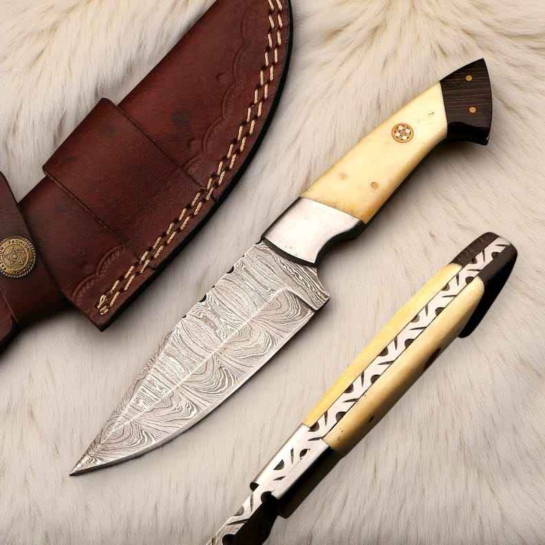 Couteaux de chasse haut de gamme faits à la main avec manche en os, lame fixe en acier Damas pour le bushcraft, le camping et la survie en extérieur