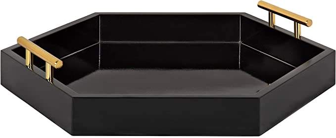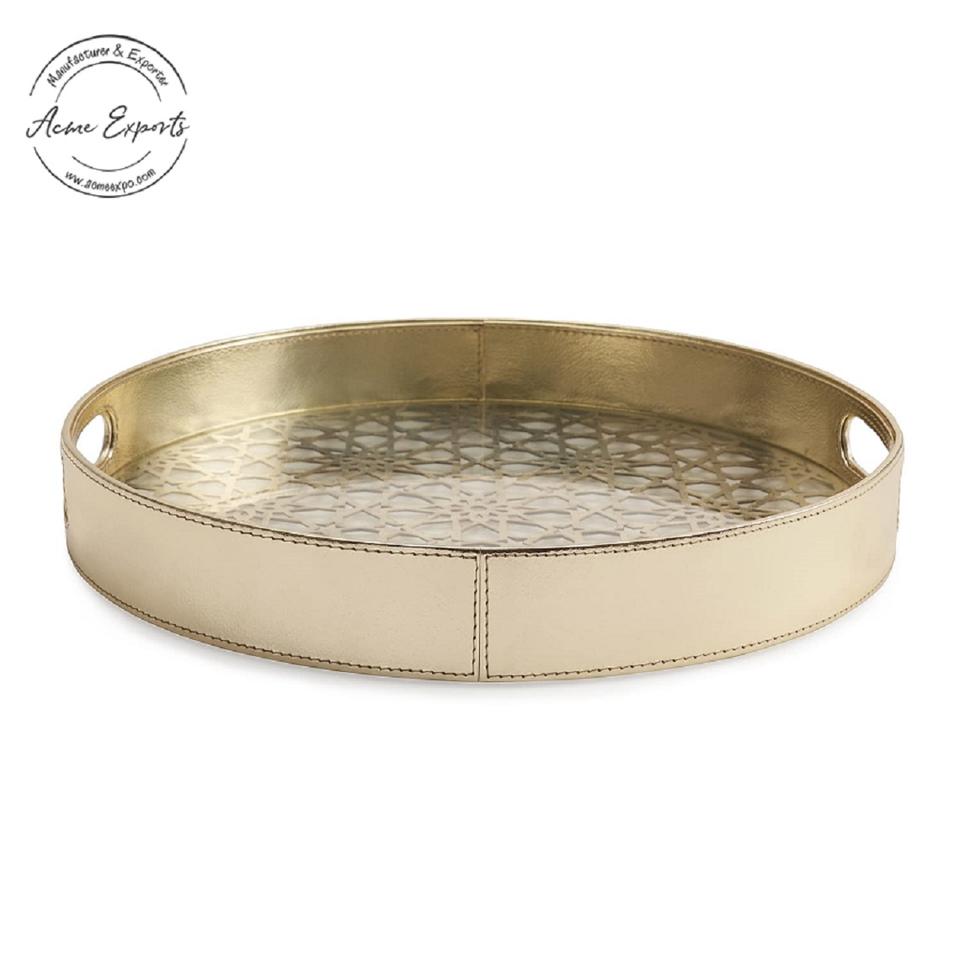 Élégant plateau de service rond en similicuir avec poignées latérales, idéal pour la décoration de bar, la table basse ou les cadeaux.
