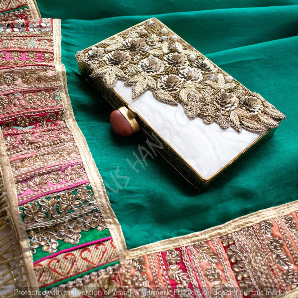 Pochette artisanale en nacre de haute qualité, très vendue, avec patch en tissu artisanal d'Inde