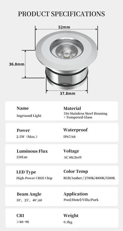 Lumière LED encastrée extérieure de haute qualité INSS-052, verre trempé, 250Lm, AC88/264V, pour hôtel, piscine, OEM, ODM, petite commande, sur mesure