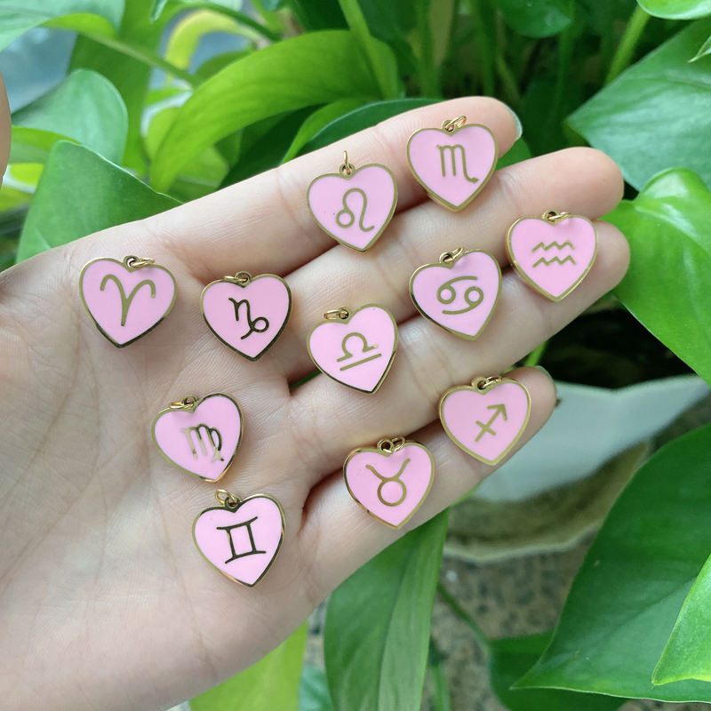 Accessoires de bijouterie de haute qualité, Horoscope en acier inoxydable et émail rose, 12 signes, breloques en forme de cœur pour la fabrication de bijoux, livraison gratuite