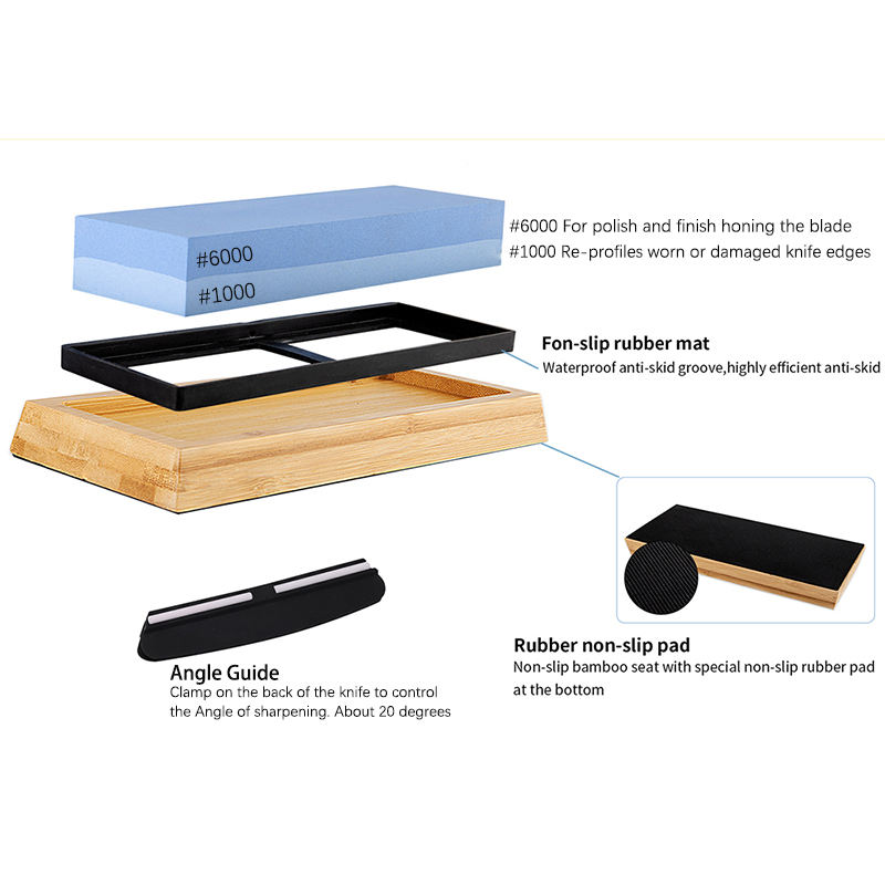 Ensemble de pierres à aiguiser pour couteaux de haute qualité Grains double face 1000/3000/6000 Affûteur avec guide d'angle de base en bambou antidérapant