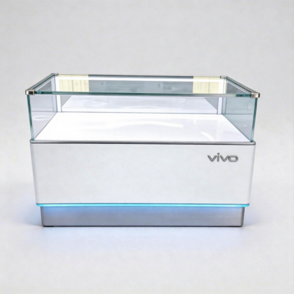 Comptoir de présentation de téléphones portables en verre trempé LED de haute qualité, design personnalisé, vitrine combinée pour téléphones mobiles