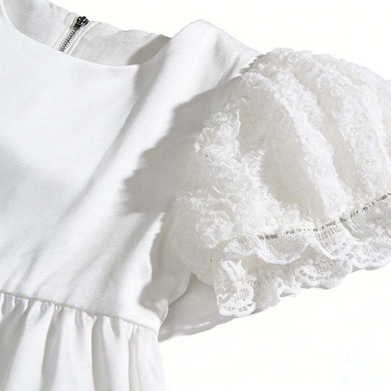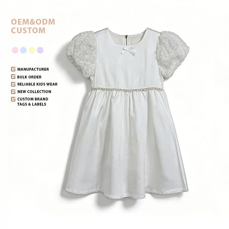 Robe de haute qualité en dentelle à manches bouffantes avec nœud et ceinture perlée, ourlet plissé respirant, style ODM doux, élégant et gracieux