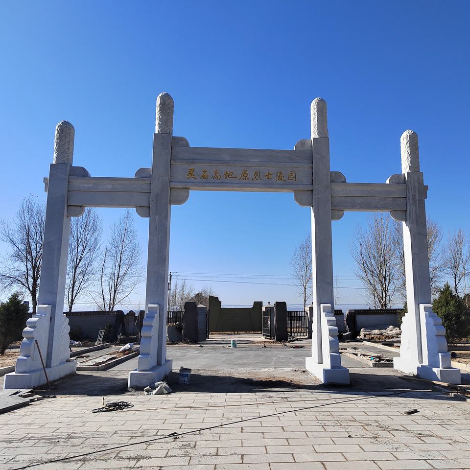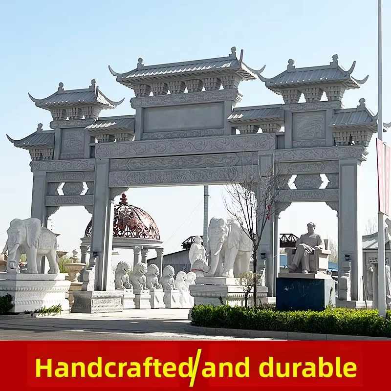 Arche sculptée en pierre de haute qualité, grande arche d'entrée de village en granit à trois portes, arche en pierre Paifang pour temple ou portail de montagne