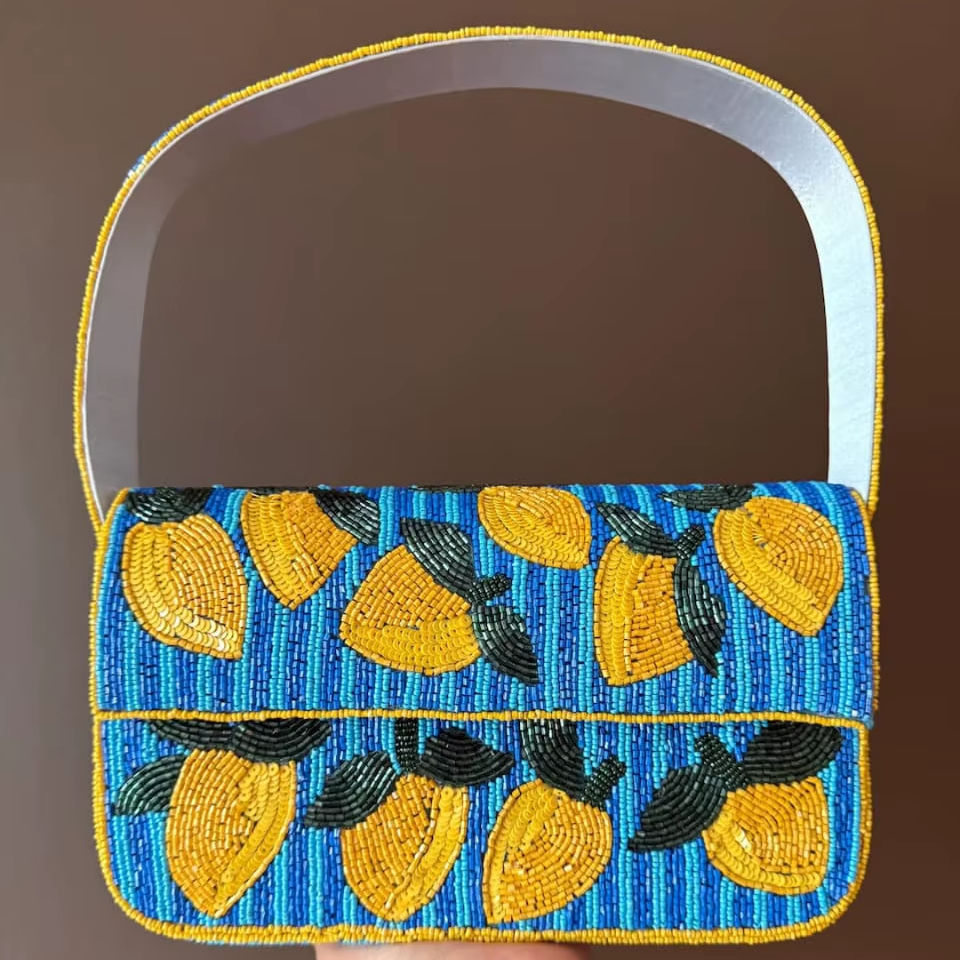 Sac à main brodé de perles à motif citron de haute qualité, sac à bandoulière rayé jaune et bleu pour femme, idéal pour les soirées et événements