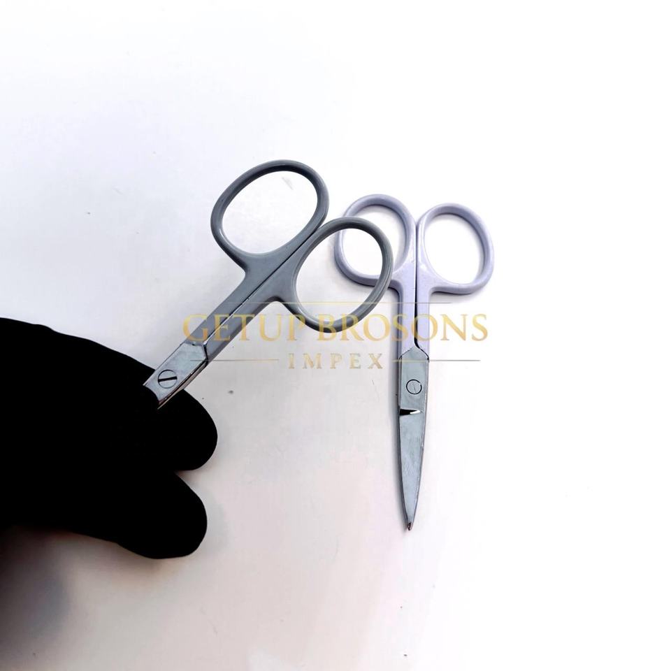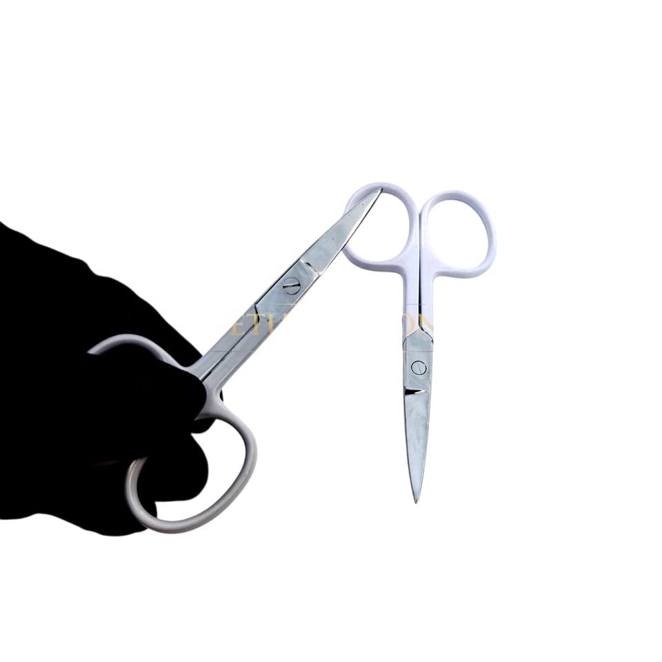 Ciseaux à sourcils miniatures de haute qualité en acier inoxydable avec revêtement en poudre gris clair, lame droite, pointe acérée, avec votre propre logo personnalisé