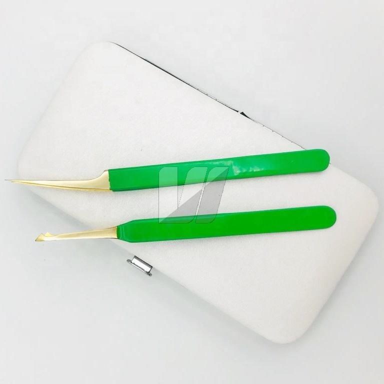 Pince à épiler d'extension de cils avec logo personnalisé vert citron de haute qualité pointe dorée durable en acier inoxydable japonais pointe pointue durable