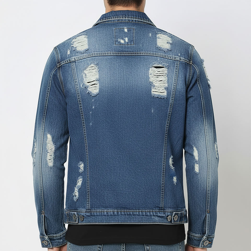 Veste en jean homme de haute qualité, coupe longue et ample, déchirée, col rabattu, bleu clair délavé, tendance