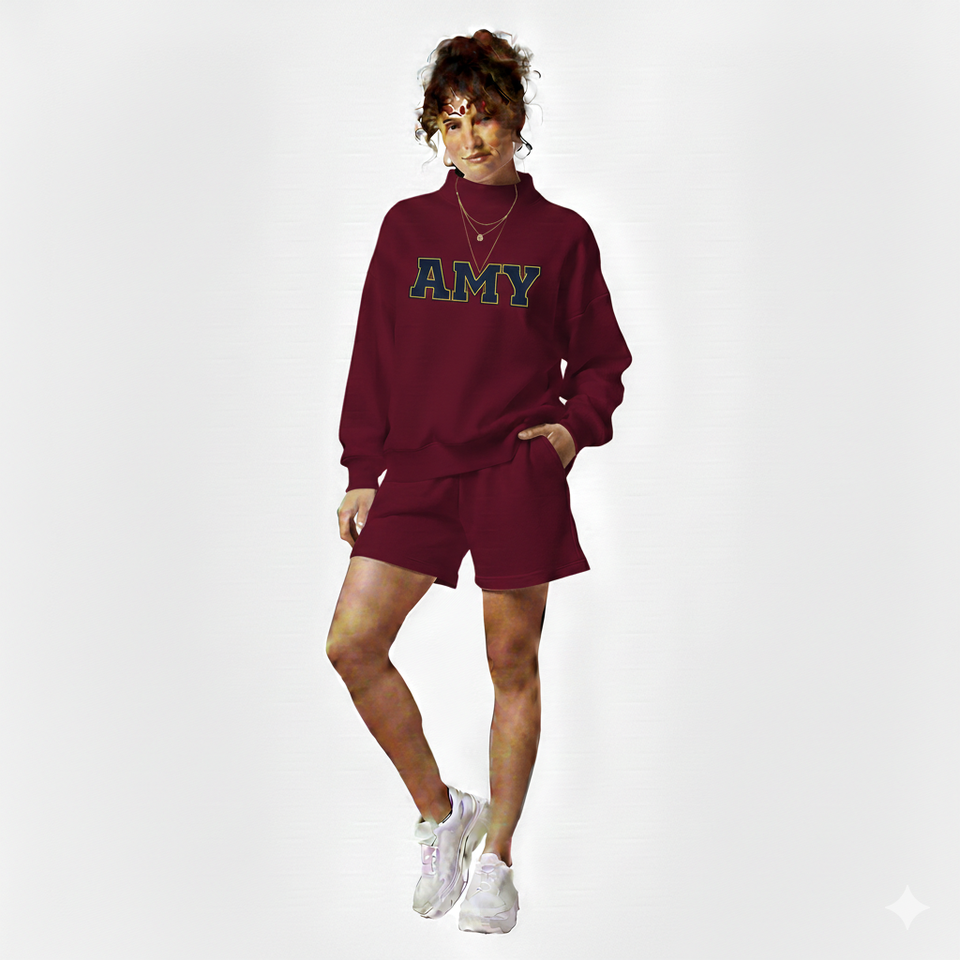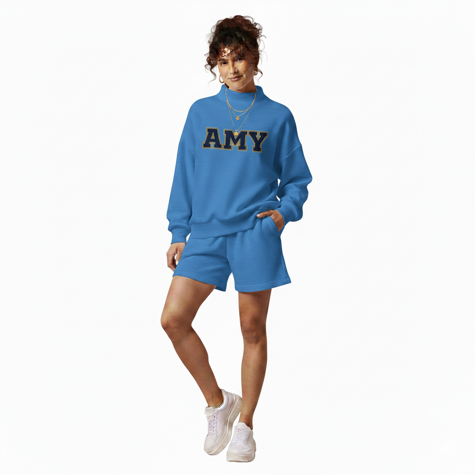 Ensemble deux pièces hiver pour femme : sweat-shirt molletonné ample à col montant et short, broderie machine, qualité supérieure