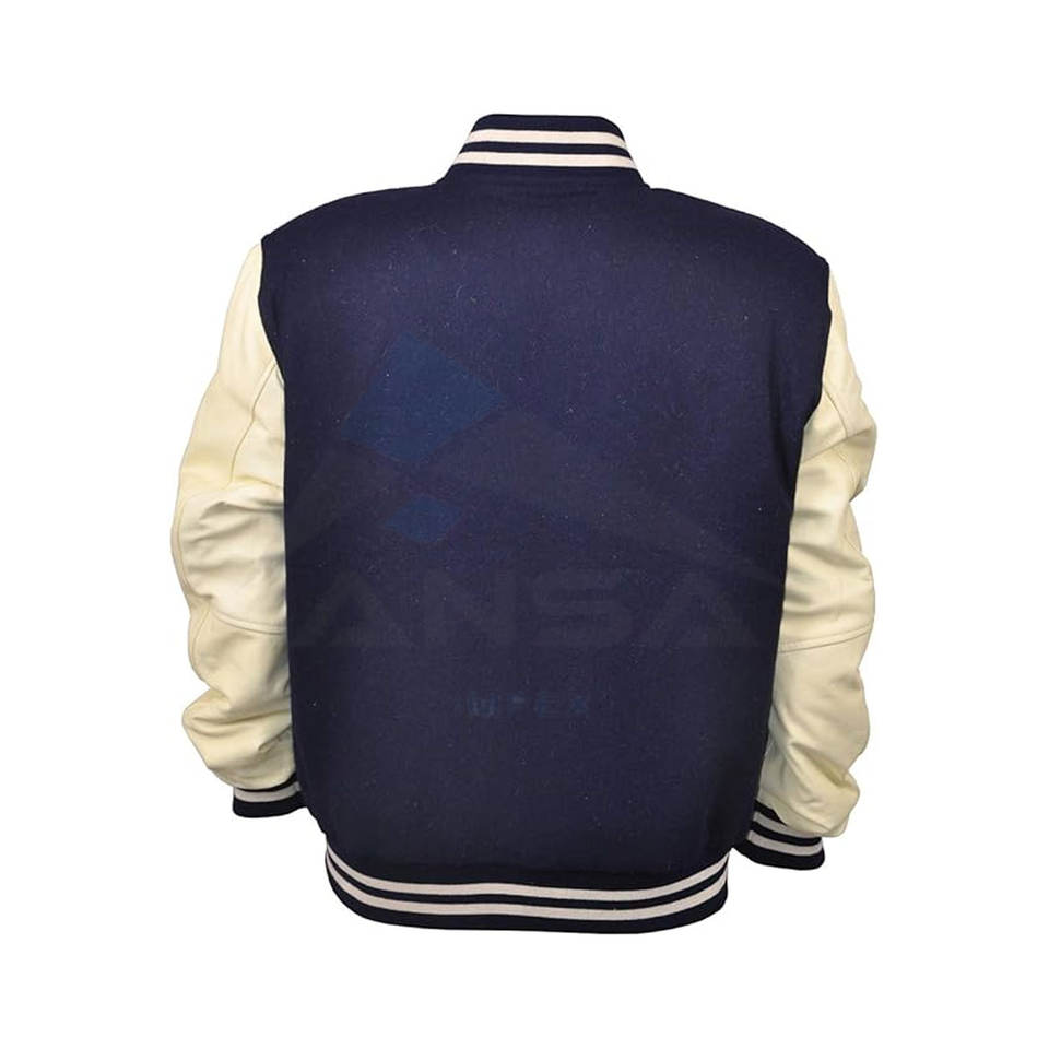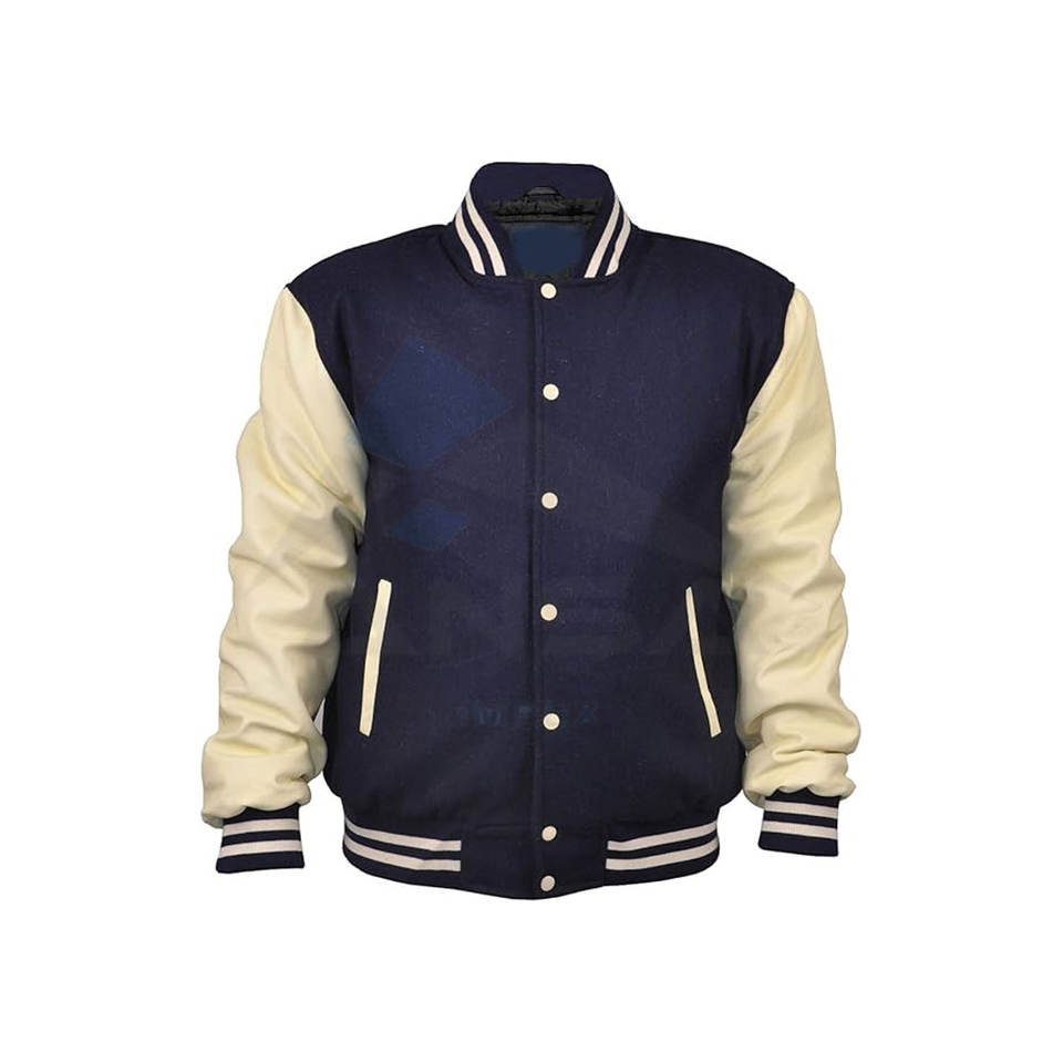 Veste universitaire pour homme de haute qualité, manches en cuir, corps en laine mélangée, bordure côtelée, doublure légère et chaude, bleu marine crème