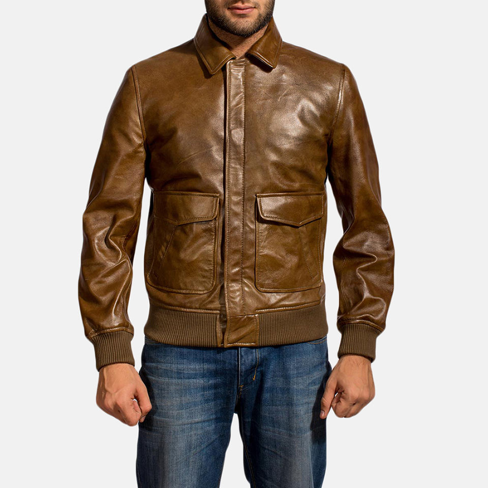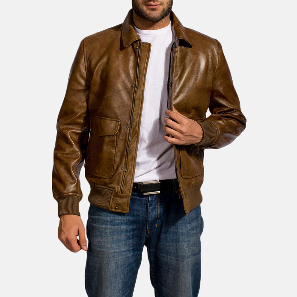 High Quality Men's Brown Leather Bomber Jacket Wholesale Price Canvas Fabric Top Selling Leather Jacket