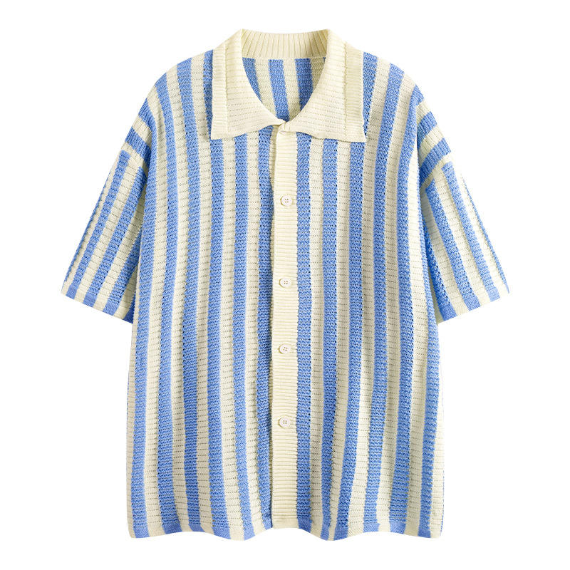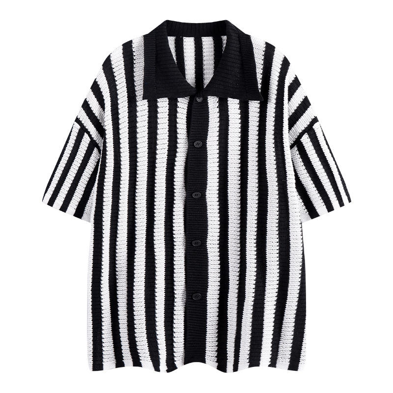 Haute qualité hommes rayé à manches courtes simple boutonnage squelette tricoté pour polos vêtements respirants revers Cardigan