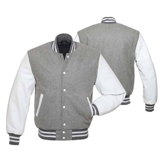 Veste universitaire d'hiver pour homme de haute qualité, en laine grise, manches en cuir, col montant, style décontracté, conception de boutons personnalisée OEM