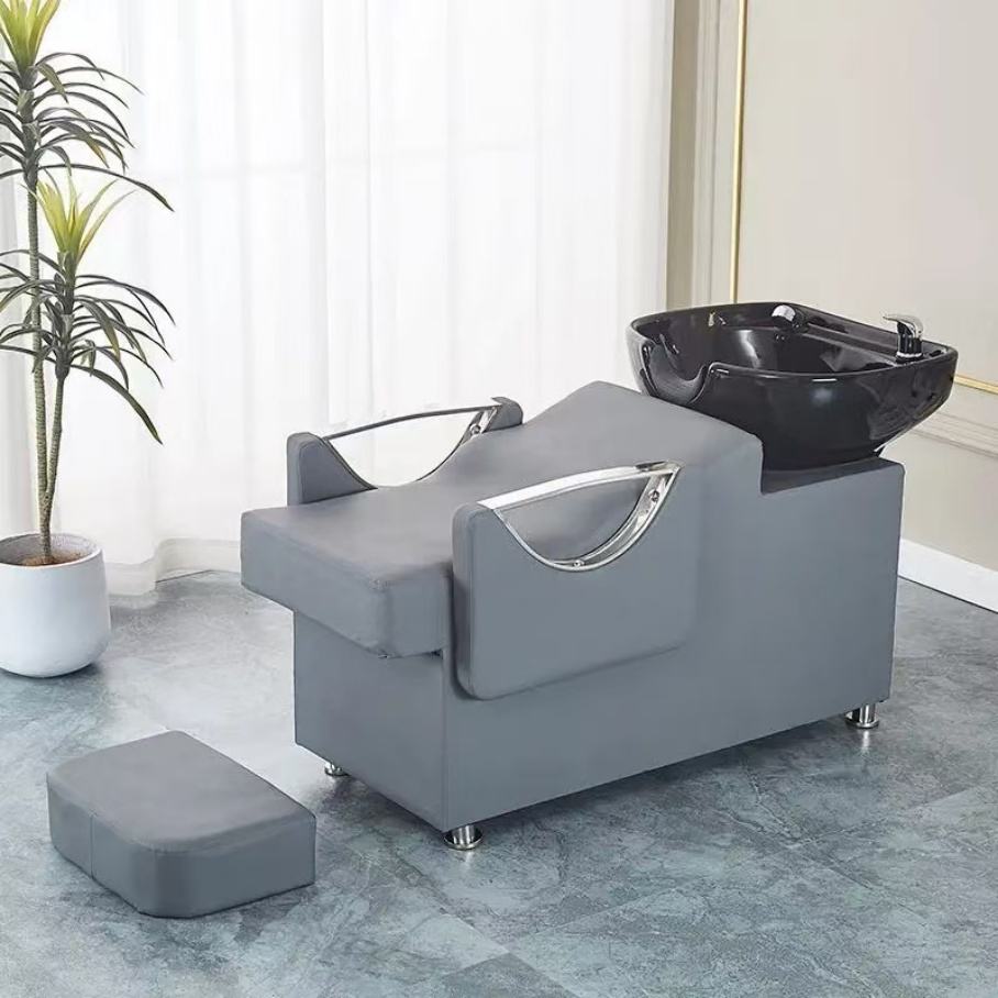 Chaise de lavage de cheveux de salon de haute qualité, design moderne et luxueux, avec dossier en métal, lavabo en céramique blanche, utilisation en hôtel, supermarché, salle de bain