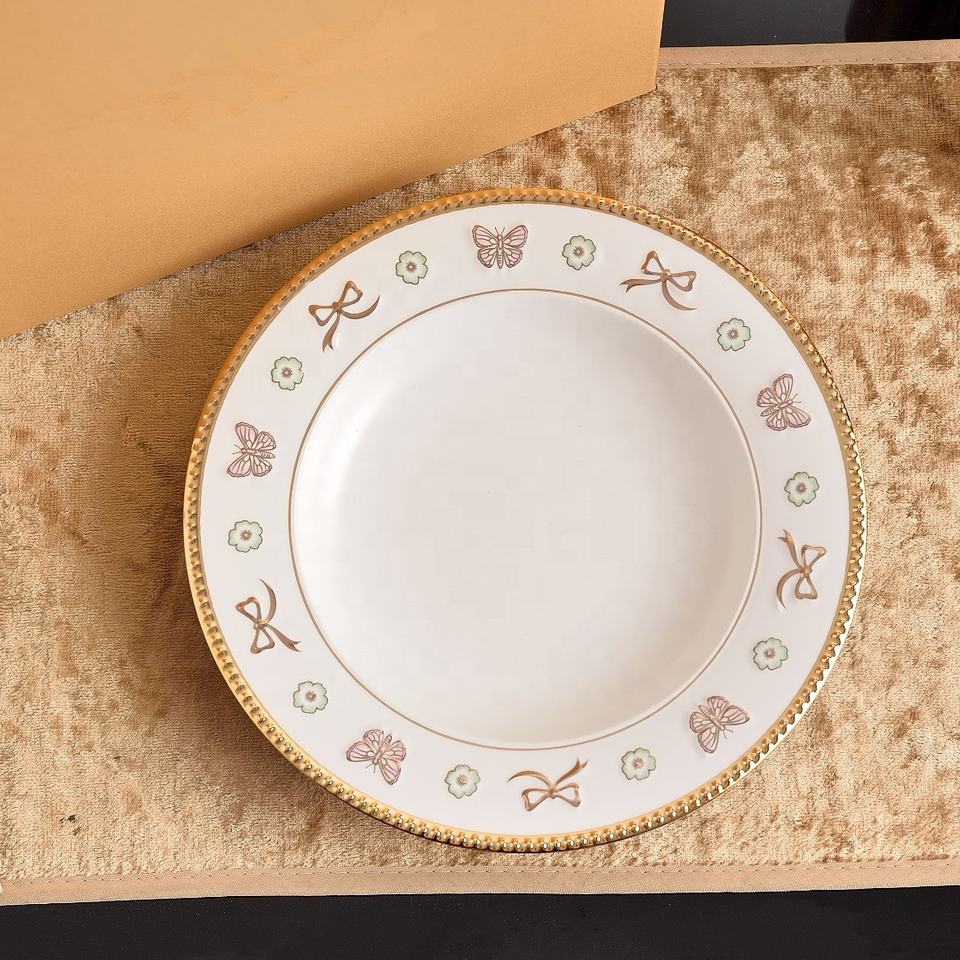 Service de vaisselle en porcelaine osseuse européenne de haute qualité, motif papillon rose moderne, assiette creuse de 9 pouces