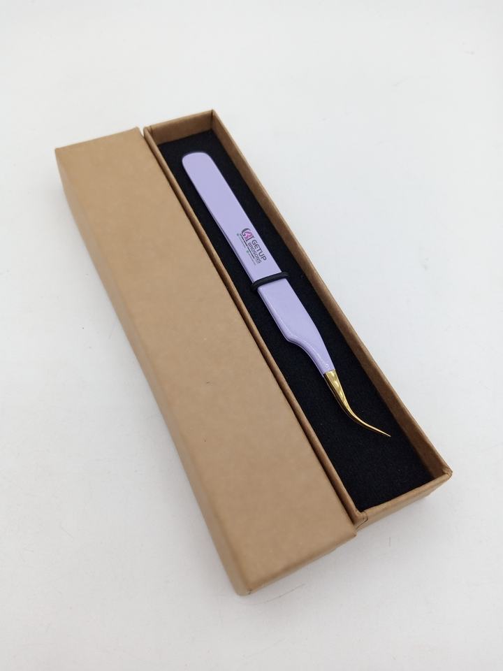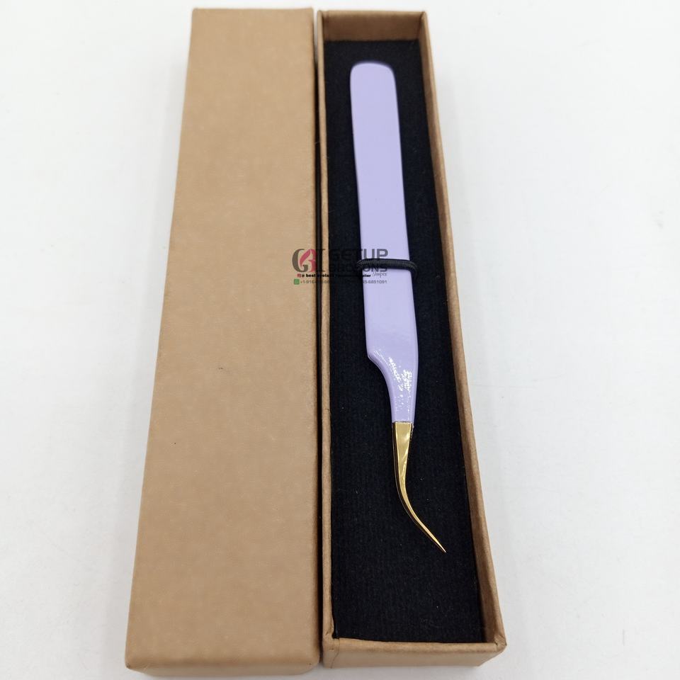 Pince à épiler en acier inoxydable de haute qualité, nouvelle, incurvée, avec revêtement en poudre violette et pointe dorée, pour extensions de cils, logo personnalisé, instrument de beauté