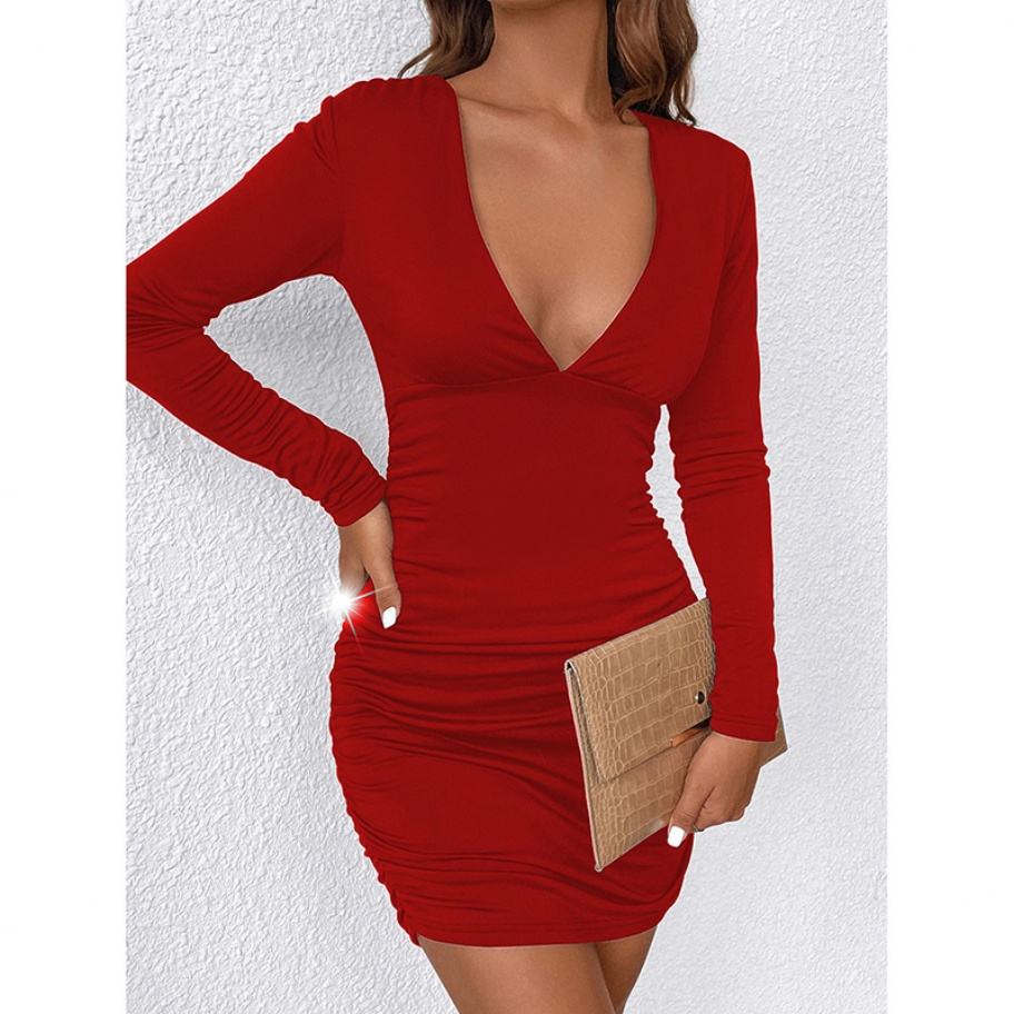 Robe de soirée moulante à col en V sexy pour femme, de haute qualité, OEM, sur mesure, à manches longues, en tricot, vente en gros