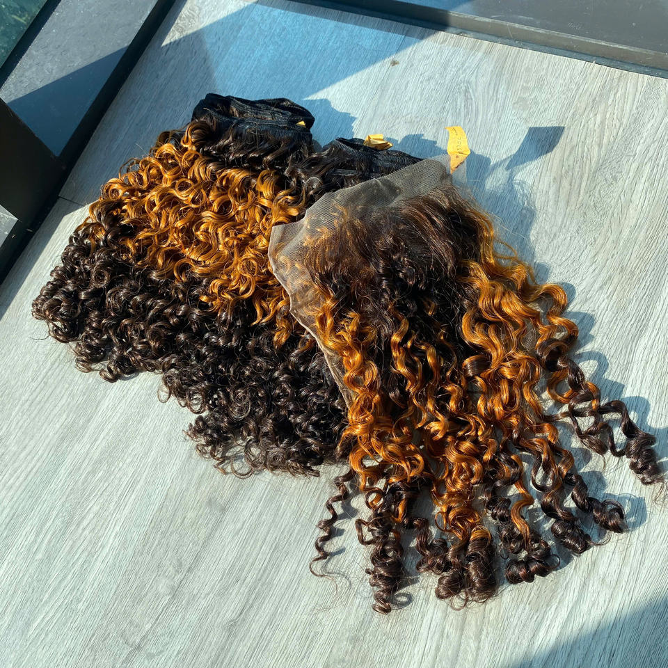 Extensions de cheveux vierges vietnamiennes de qualité supérieure, boucles pixie, teintes avec une couleur ombrée, prix de gros