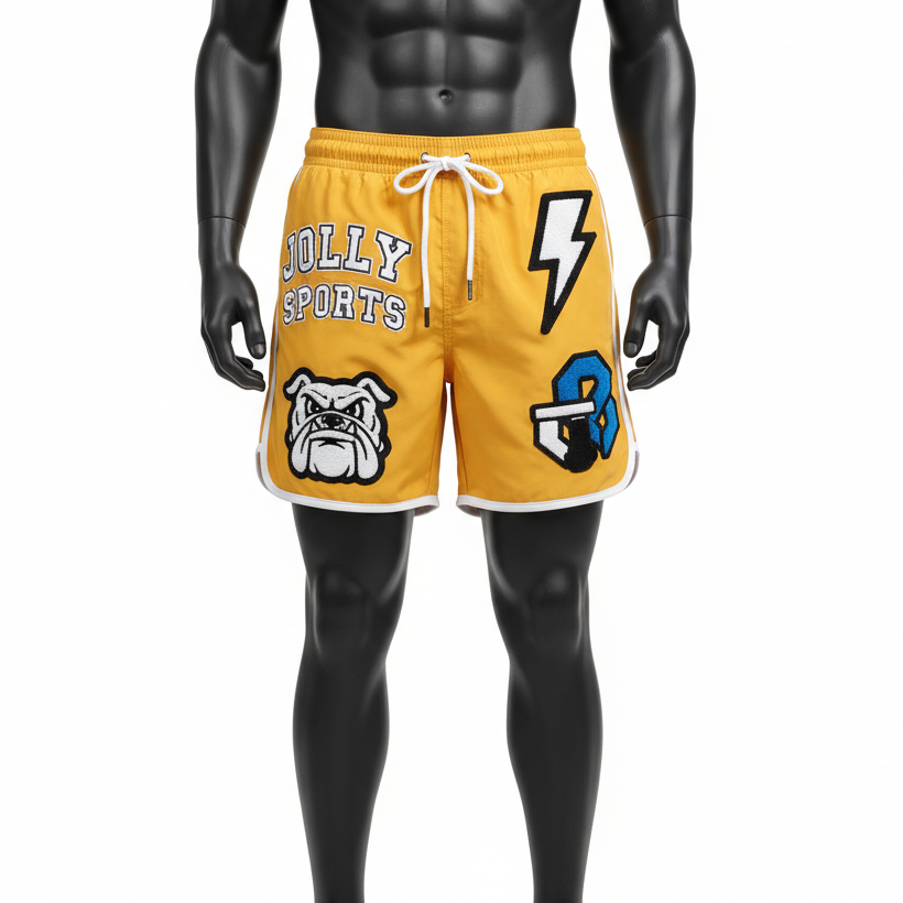 Shorts de bain pour homme en microfibre polyester de haute qualité, jaune moutarde, avec panneaux latéraux à bordure contrastée, logo personnalisé.