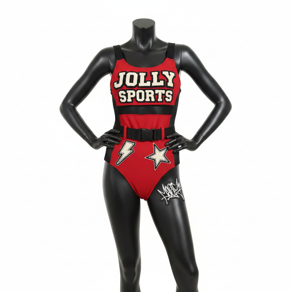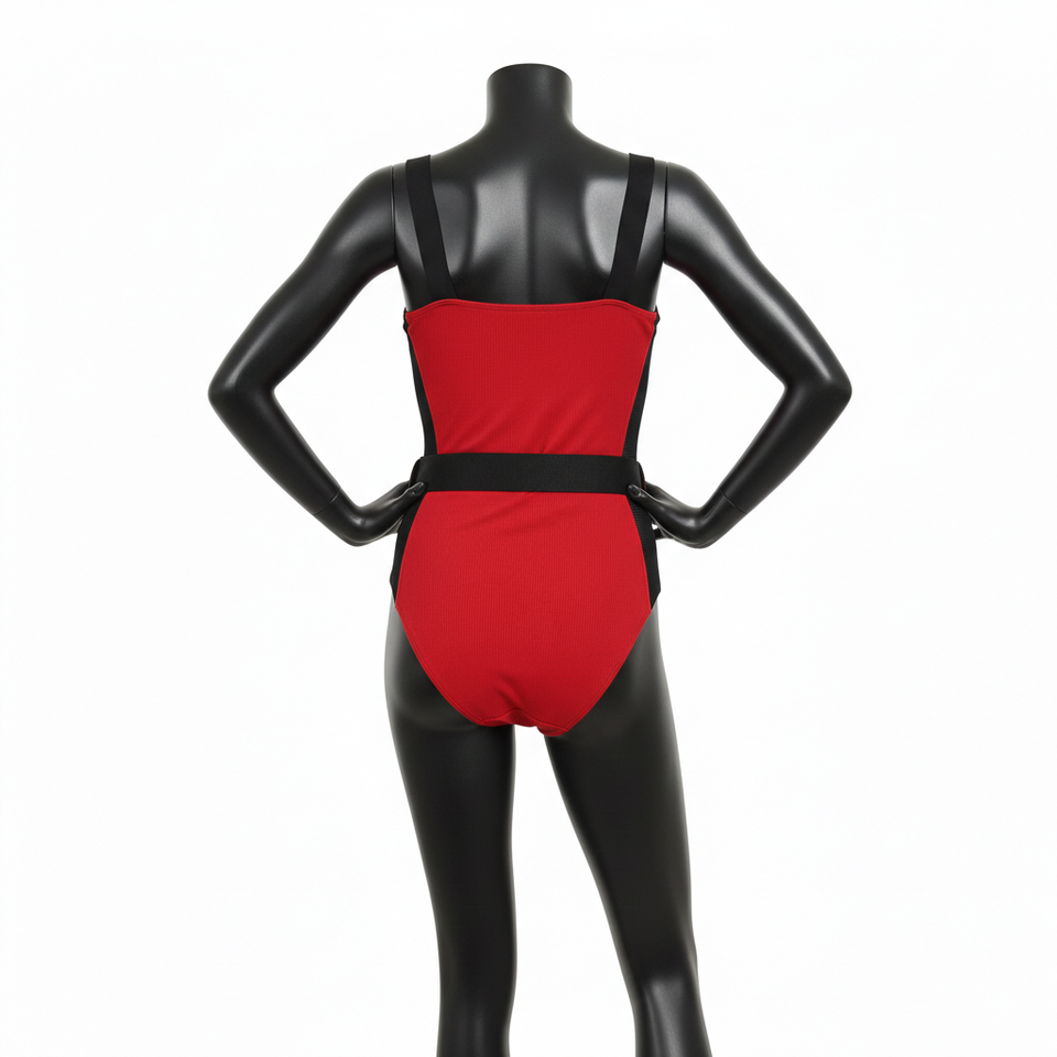 Ensemble de maillot de bain en polyester et élasthanne de haute qualité, rouge et noir, avec empiècements en mesh contrastant, logo brodé personnalisé, pour femme.